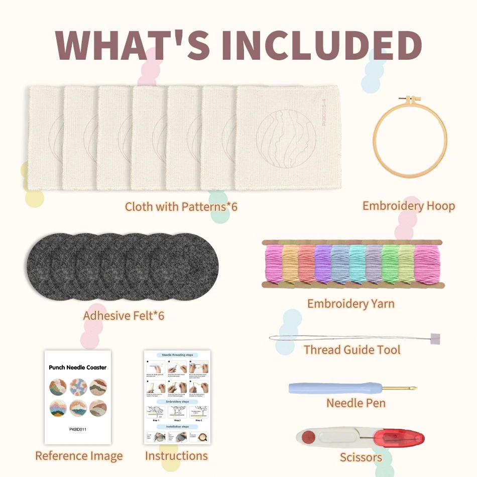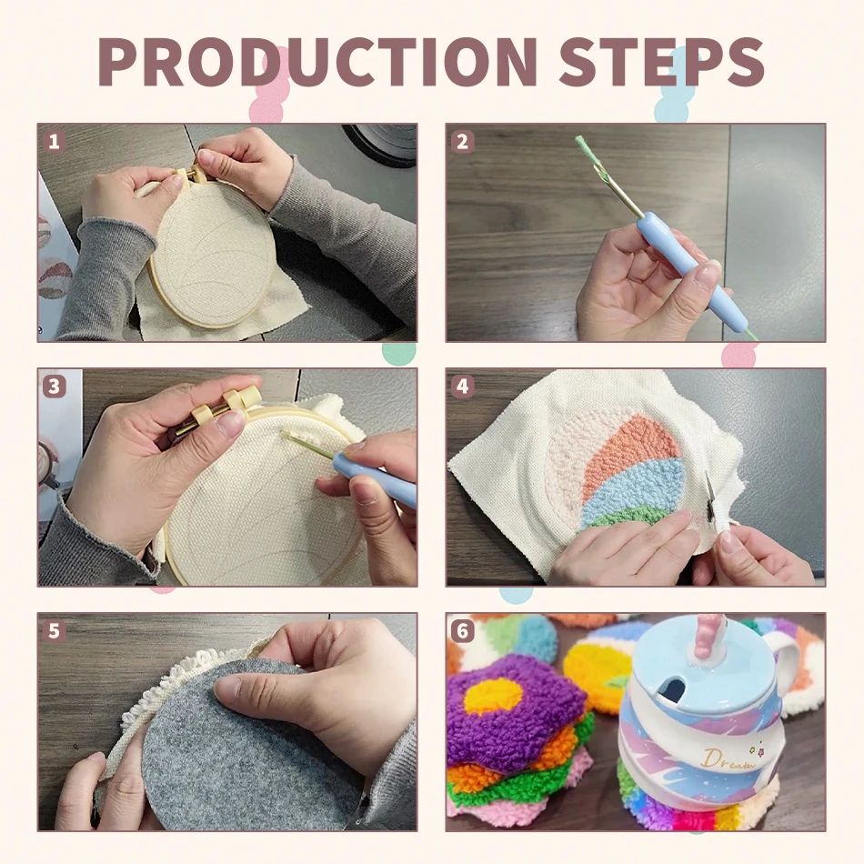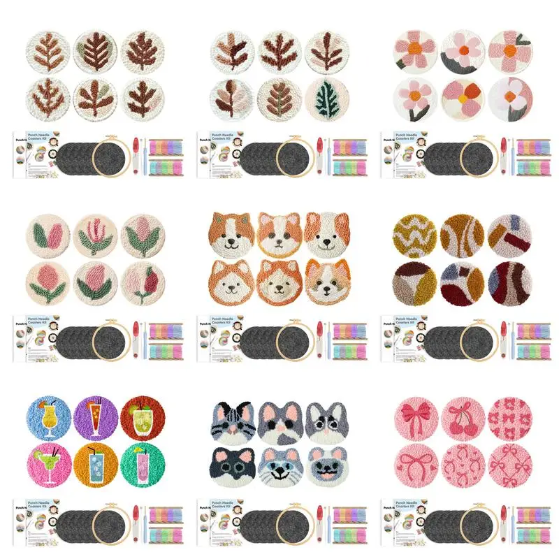 This 6-piece punch needle embroidery coaster set features charming flower and dog patterns, perfect for beginners and hobbyists alike. Each kit includes all materials needed to create handmade coasters, combining functional use with creative needlework. Ideal for decorating your home, gifting, or enjoying a relaxing crafting activity.